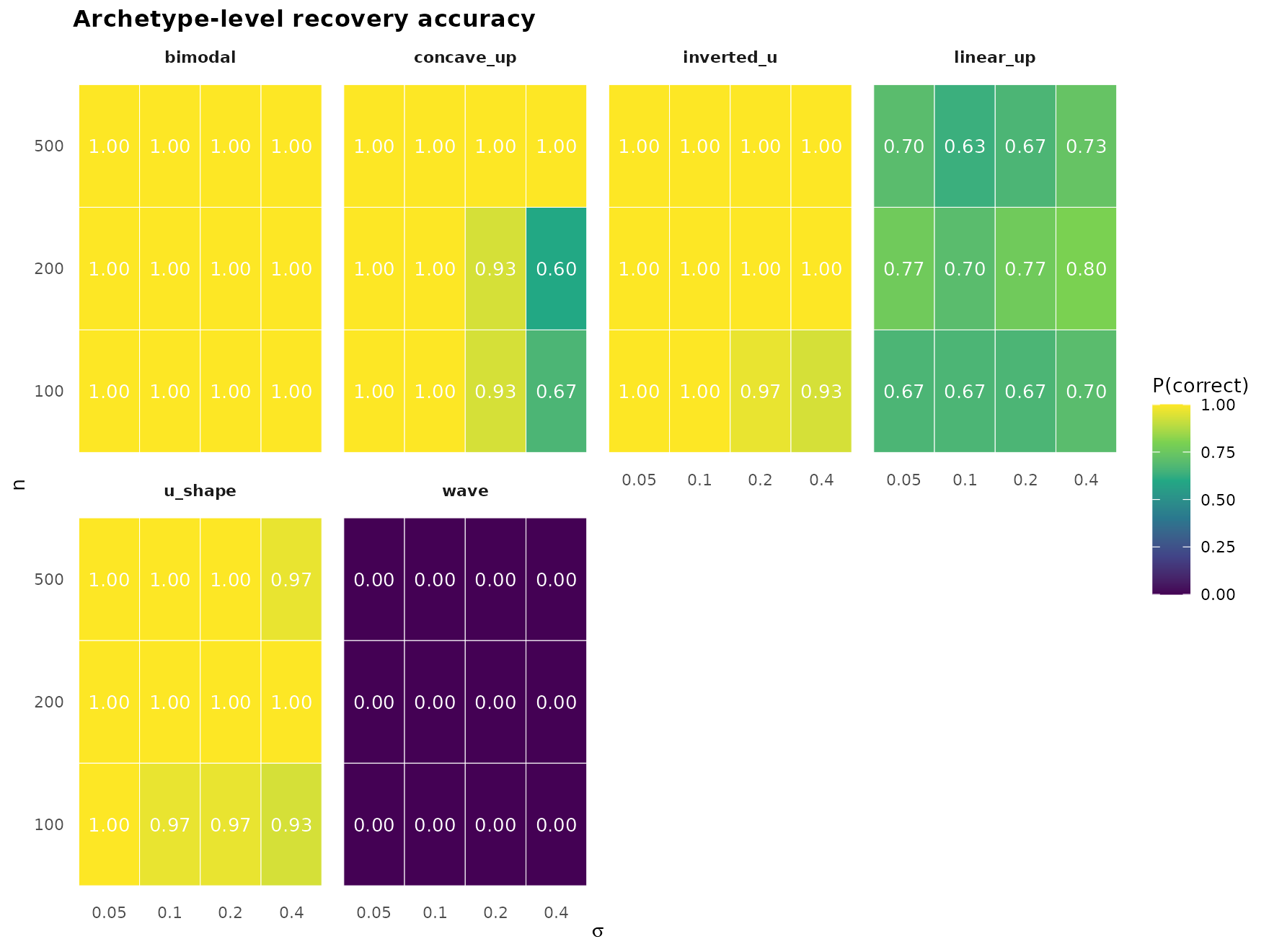 n = 500,sigma = 0.05, archetype accuracy exceeds 0.90 for every shape. -