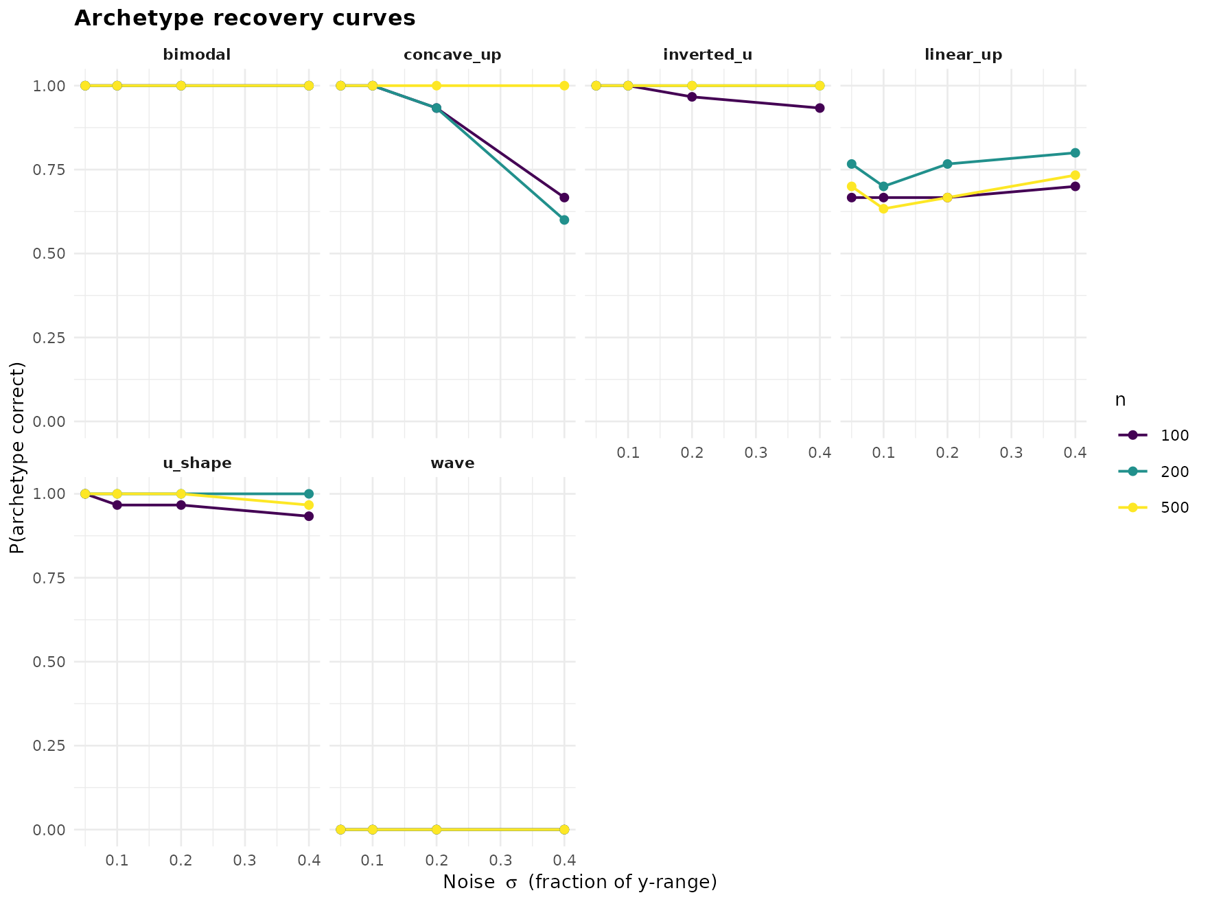 The package ships a small-footprint precomputed sweep — 6 shapes (one per non-degenerate archetype) × 3 sample sizes × 4 noise levels × 30 replicates = 2160 fits — so you can explore the API without running the full sweep yourself.